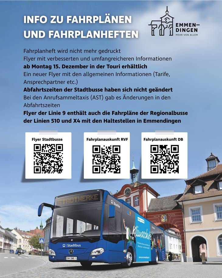 Der Flyer der Linie 9 enthält zusätzlich auch die Fahrpläne der Regionalbusse der Linien 510 und X4 mit den Haltestellen in Emmendingen.
